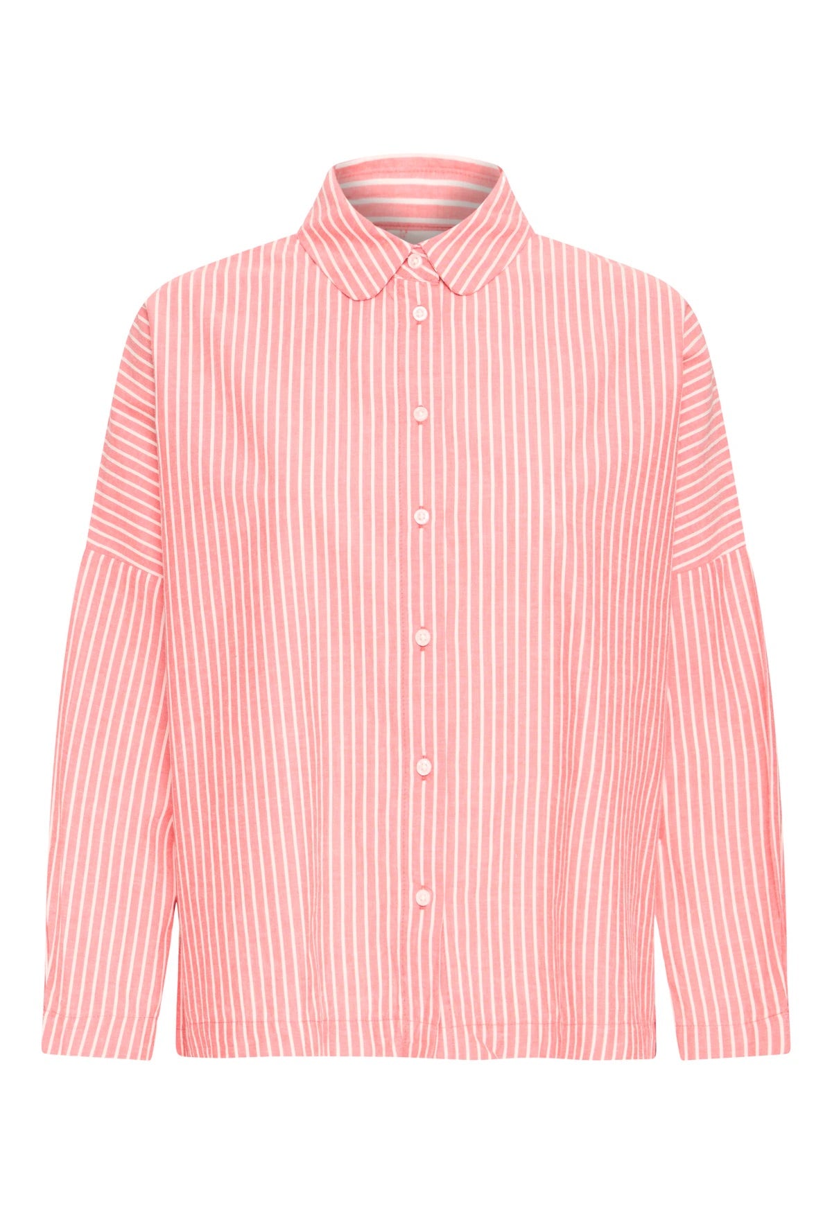 This lovely striped shirt is a boxy oversized fit . It has a Peter Pan type collar and button down front , features drop shoulders and long sleeves for a modern , effortless look .