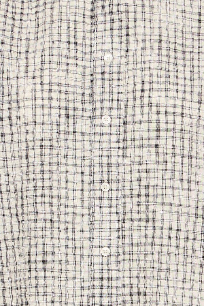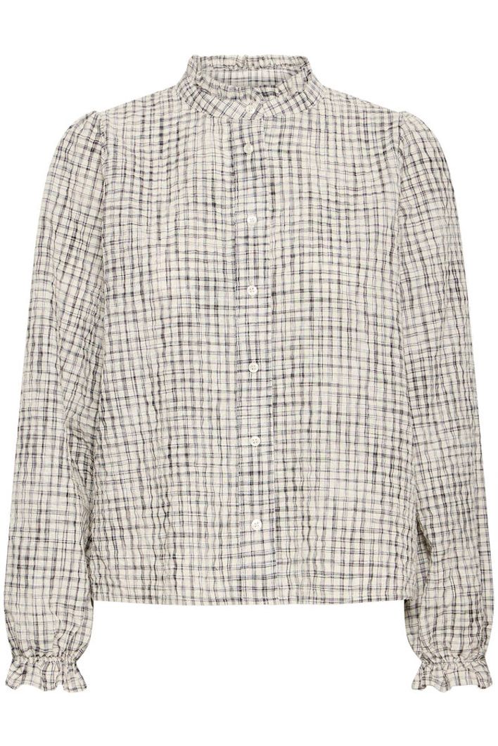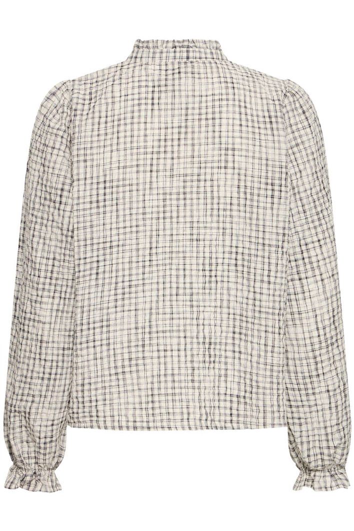 The Hesima shirt features a black and check woven pattern that adds a striking touch to any outfit. Designed with a delicate ruffle along the neckline and elasticated ruffle cuffs .