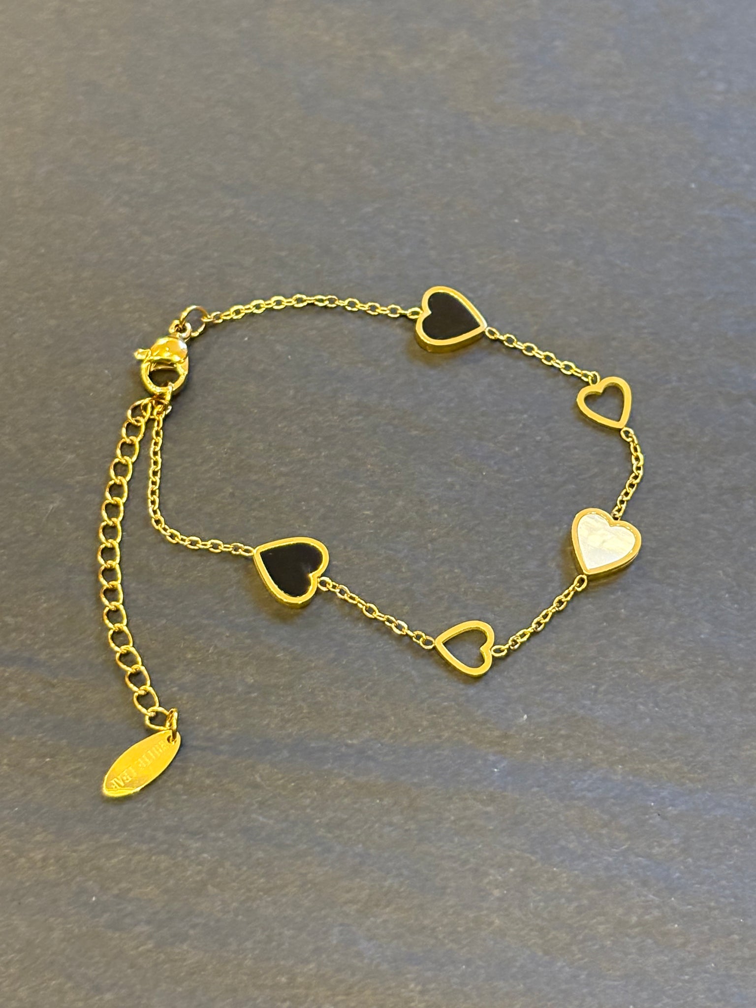 This pretty bracelet has solid black and moonstone coloured hearts and open heart detail.