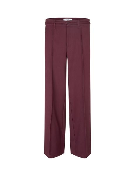 Burgundy wide trousers with two side front and two back pockets, belt loops and tie detail which sits just below the the waistband.