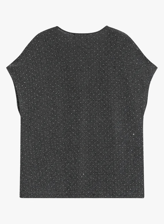 A short sleeve, v neck, silver sparkle top to elevate any outfit.