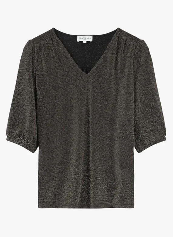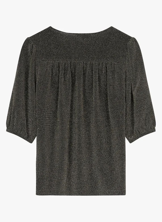 A lurex jersey top with 3/4 sleeves and a V-neckline., - Its gathers at the shoulders, cuffs, and back yoke bring a modern touch to this. Available in Navy and Gold