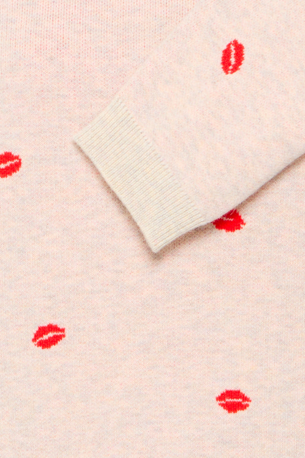 Red little lips adorn this cosy knit and the back has a little teardrop buttoned opening.