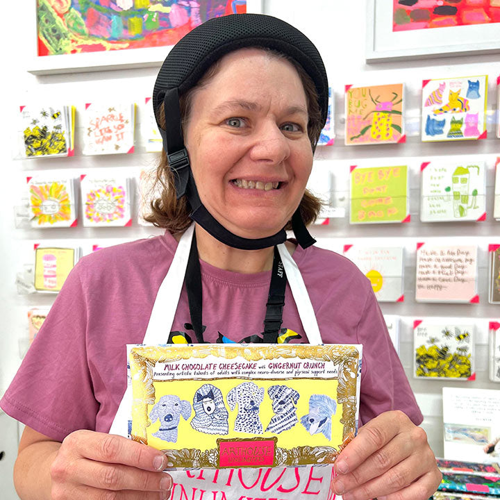 Each bar is lovingly wrapped in coloured foiled, and placed inside a fully recyclable paper envelope, that features the fantastic artwork of the ARTHOUSE Unlimited artists.