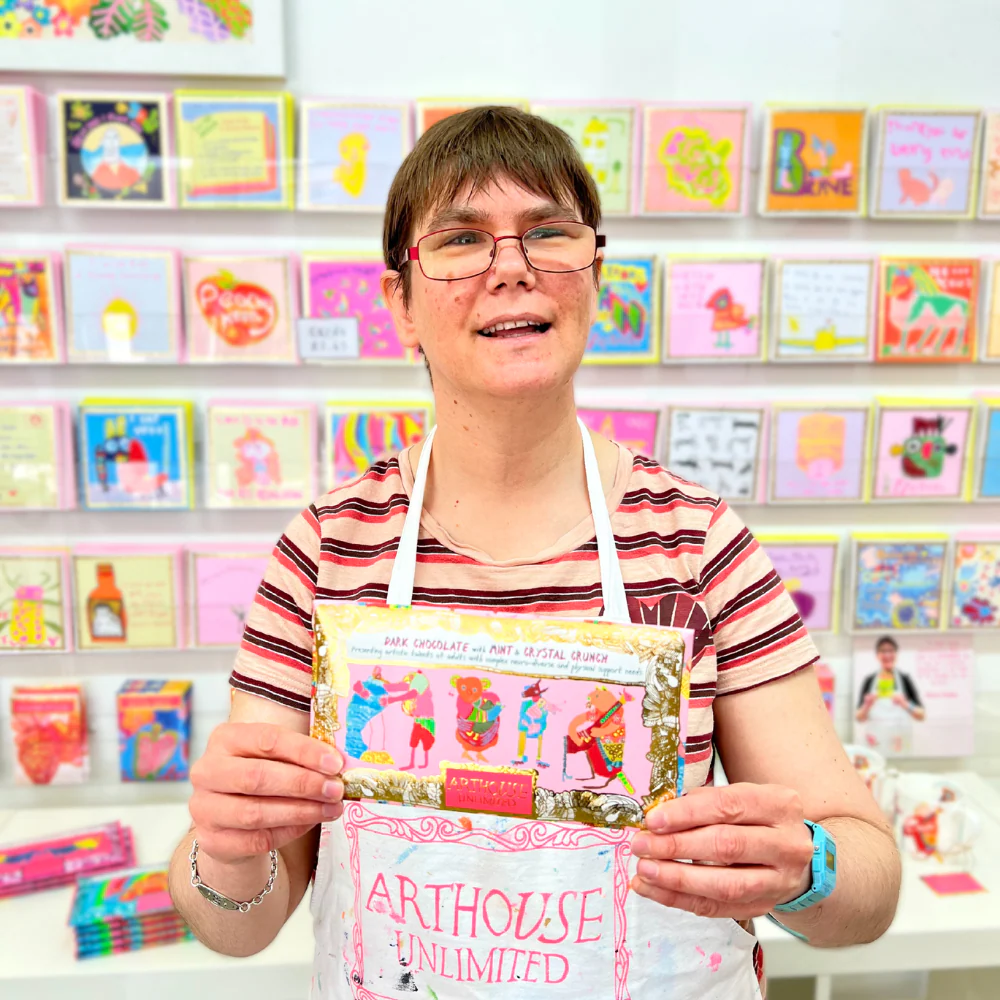 Each bar is lovingly wrapped in coloured foiled, and placed inside a fully recyclable paper envelope, that features the fantastic artwork of the ARTHOUSE Unlimited artists.