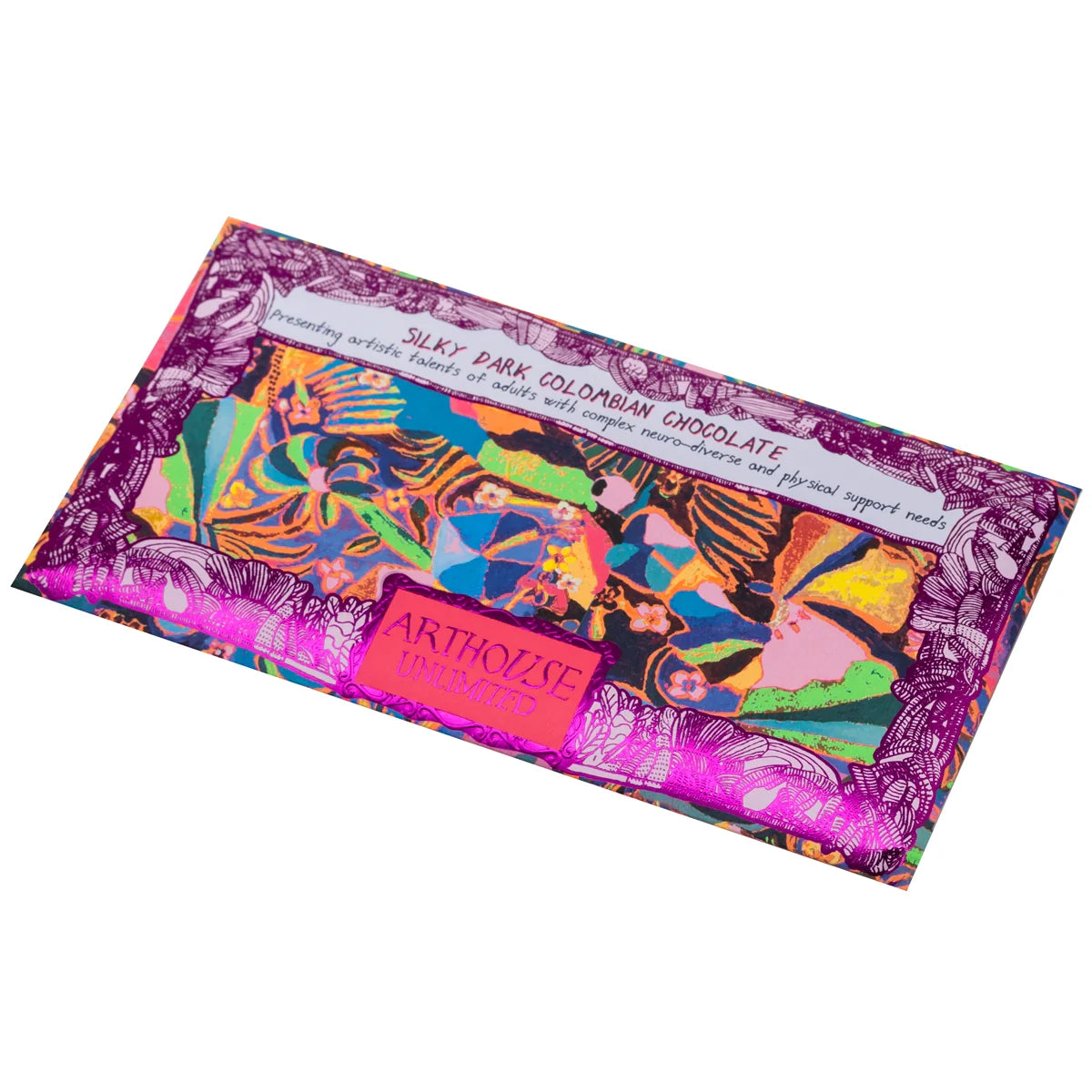This silky dark Colombian chocolate bar is a delight for dark chocolate connoisseurs everywhere. Made in the UK with responsibly sourced cocoa this bar features Psychedelia, an artwork created by artist Laura Tregellas and presented in a dazzling purple frame. An ideal gift for chocoholics, art lovers & good-cause supporters everywhere!
