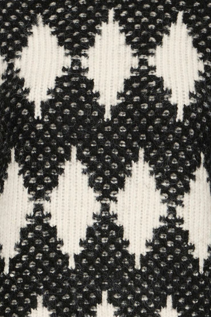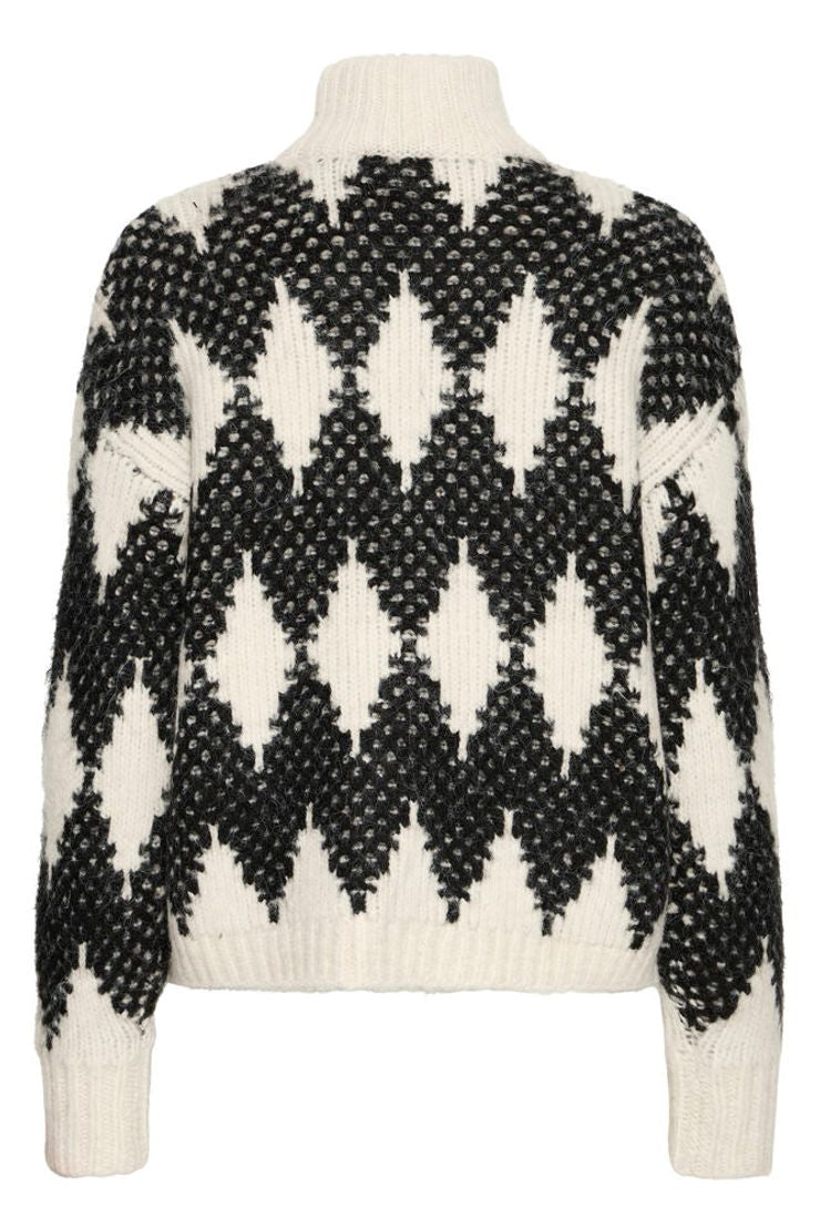 A striking cosy sweater with an all-overvzigzag jacquard in cream and black. Long sleeves and a turtle neck keep out the chills!