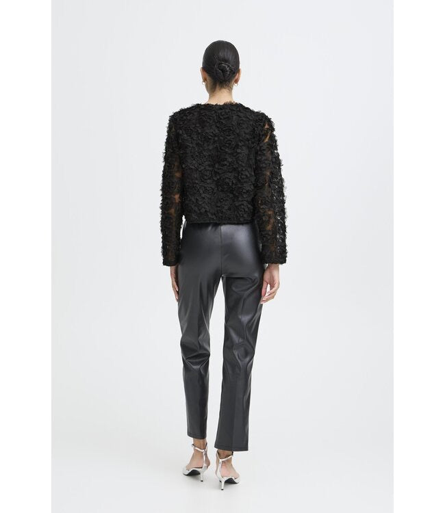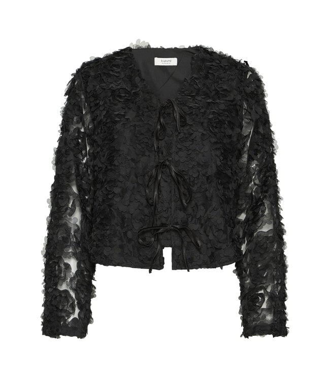 Turn heads with this statement black jacket, featuring a stunning 3D floral texture that adds depth and drama to any look. The soft tie- front and sheer sleeves make it effortlessly chic.