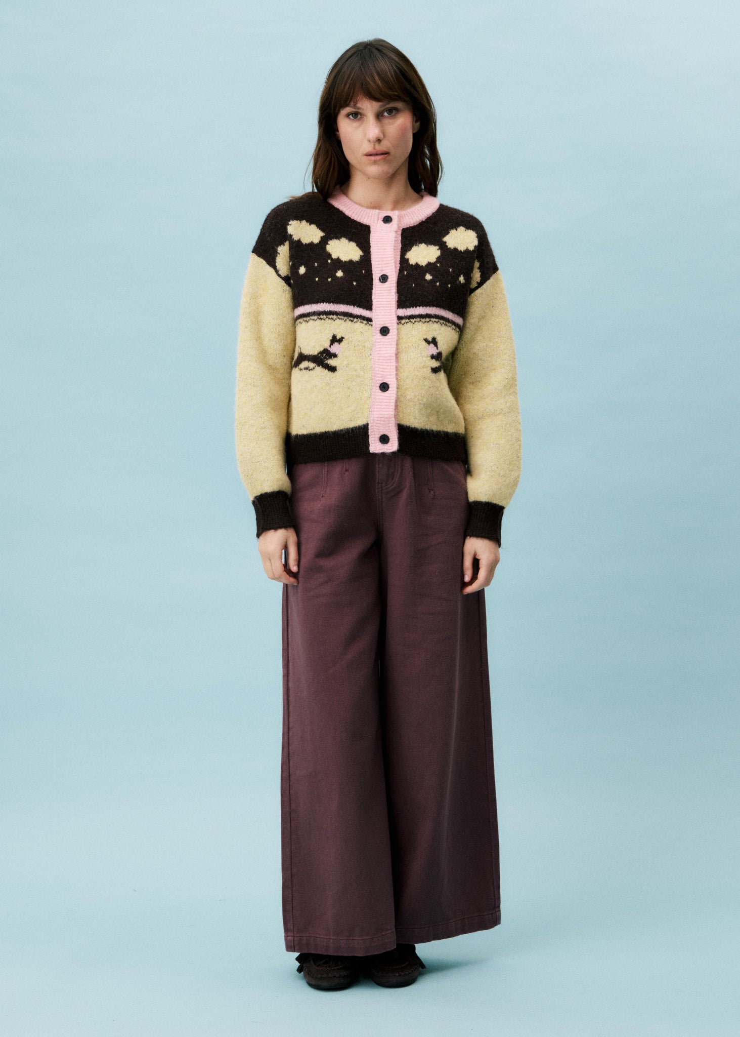 This is a cosy , playful knit cardigan , slightly oversized fit. It has soft earthy shades of soft pink ,brown and oatmeal.