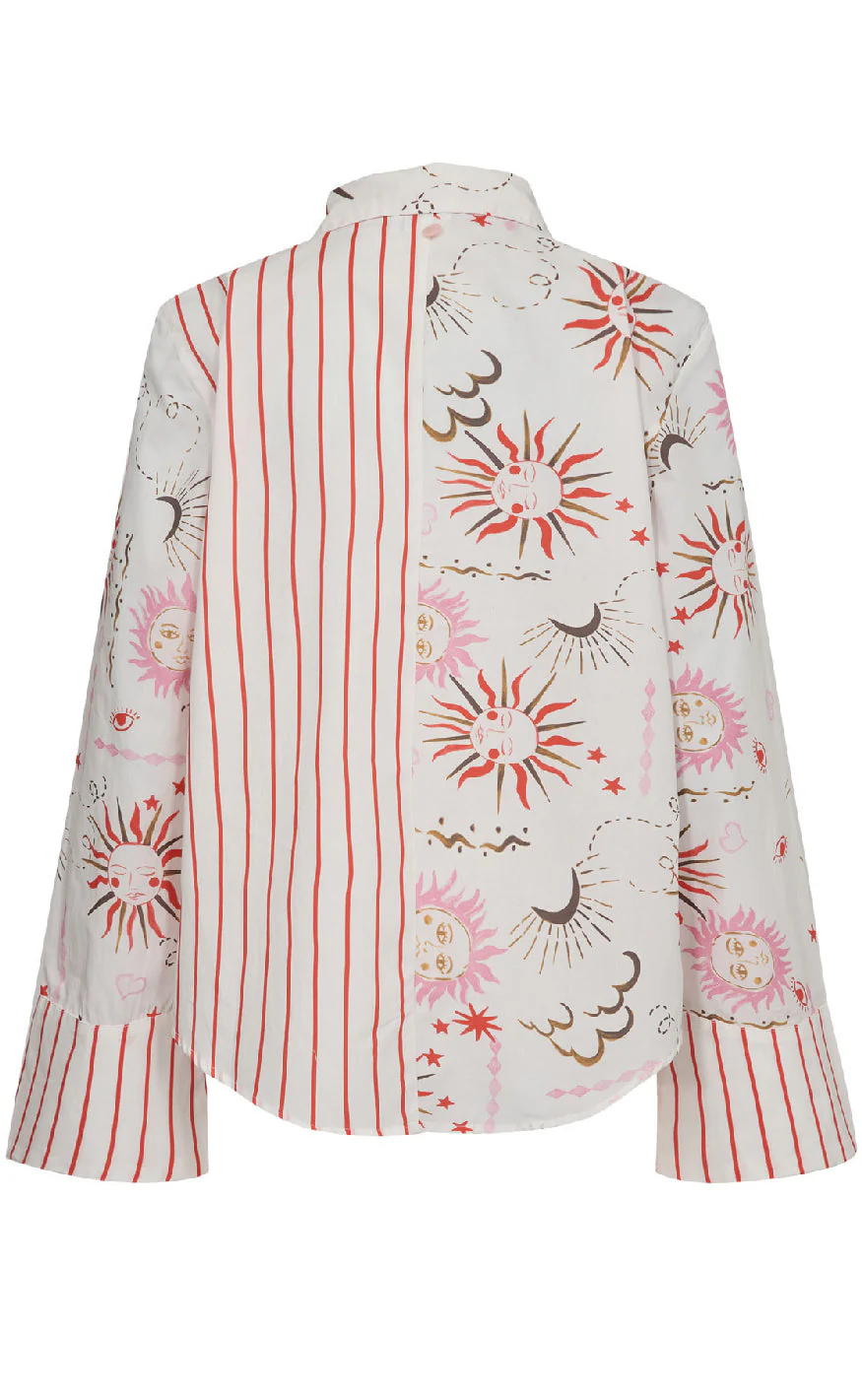 This unique shirt from Nümph has an eye-catching design that combines classic red stripes with an imaginative print of sun and star motifs.