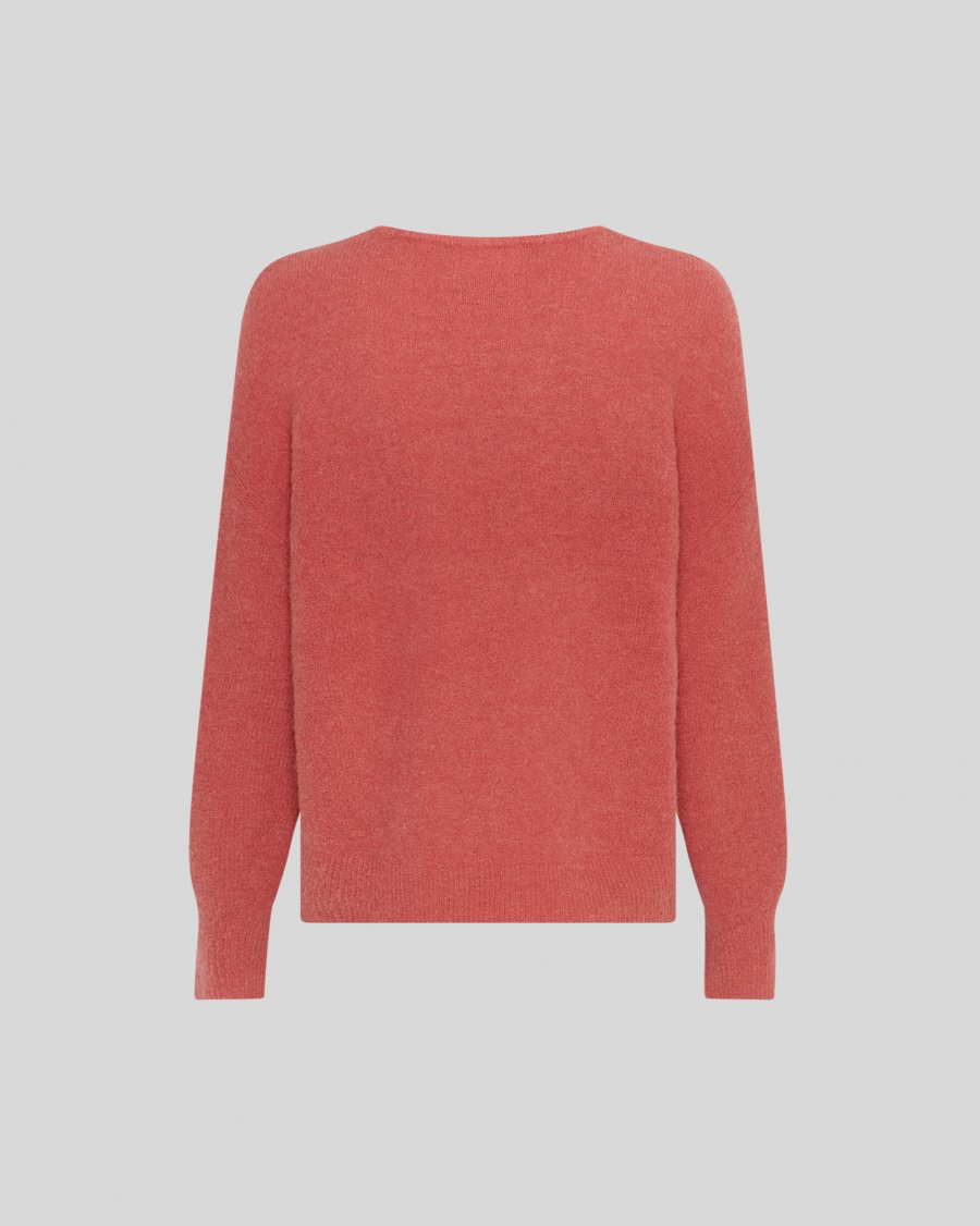 A beautiful, rust coloured, wool mix, knitted pullover with a v-neckline. It features long sleeves with ribbed cuffs and ribbed hem. Designed with dropped shoulders.
