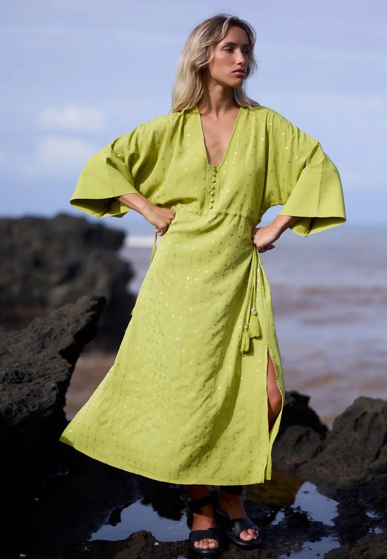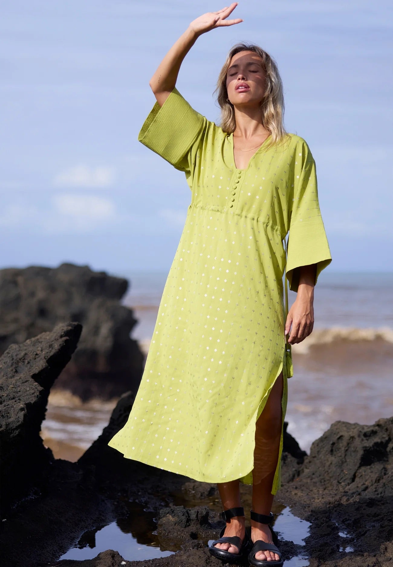 Effortlessly glamorous, the Helena Kaftan in vibrant green is crafted from flowing crepe in a relaxed, oversized midi silhouette.